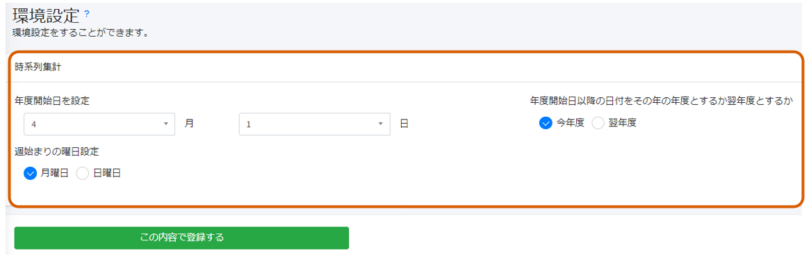 集計する際に営業年度の期首の年に含める。期末の年に含めるか設定します。
